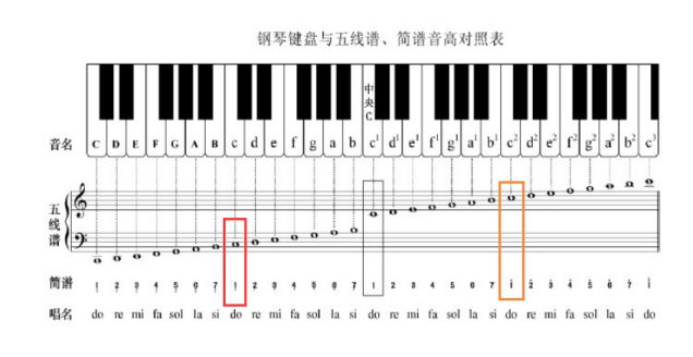 如图所示,我们简谱中的数字1与我们高音谱表中下加一线的do,也就是我们经常说的中央C是同一个音。