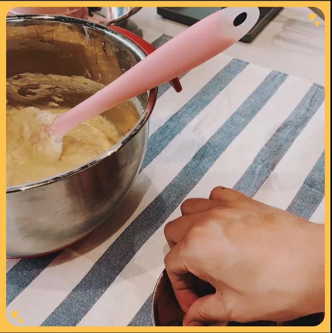 8.模具垫一层烘焙油纸,将面糊倒入模具,震动,排除气泡;