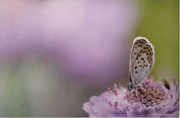 在使用微距镜头拍摄小昆虫时,背景的散景效果会很强,色彩上容易变得单调。在留白处安排一些模糊的花影,能够增加整体的色彩。在蝴蝶的对角线上安排散景,不仅可以使蝴蝶和前景散景形成对比,还能通过色彩使画面均衡。此外,还能突出蝴蝶这一主题。