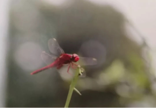 因为拉近拍摄会使蜻蜓头部以外都变得模糊,所以摄影师还是选择了适当的距离,既保证了远景里能看到自然的氛围,又使蜻蜓在照片中占据的位置恰到好处。