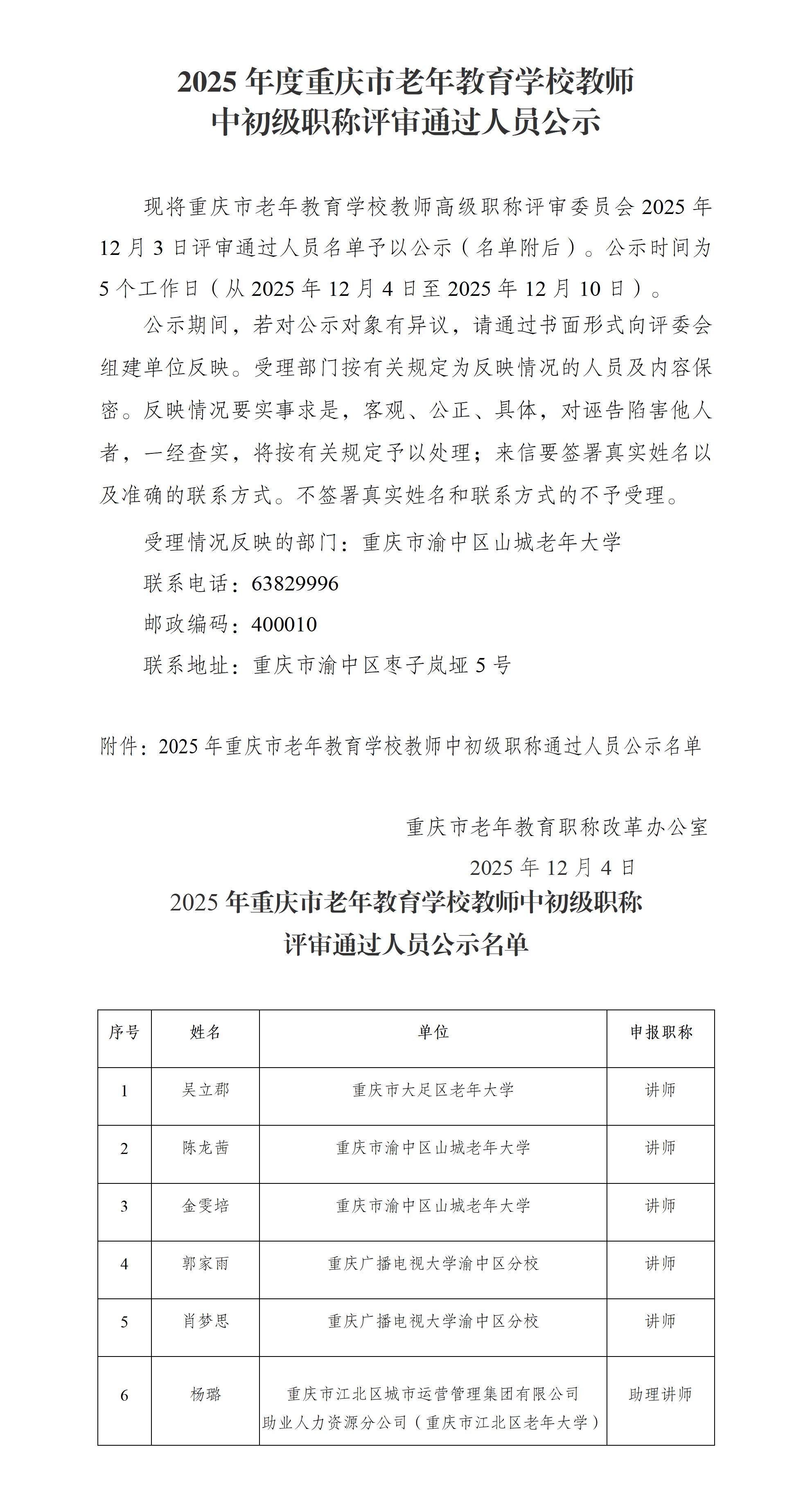 2025年度重庆市老年教育学校教师中初级职称评审通过人员公示(1)