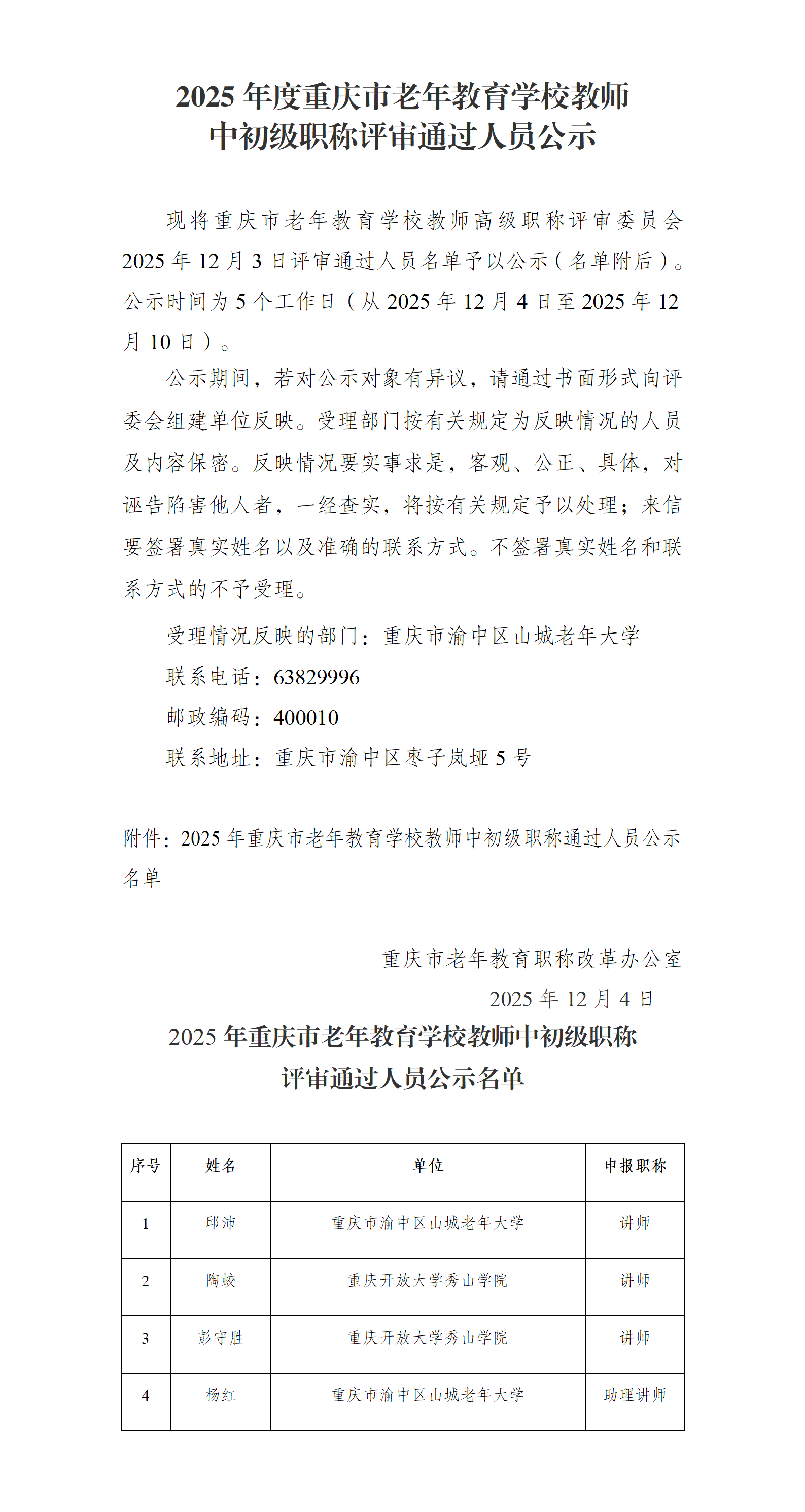 2025年度重庆市老年教育学校教师中初级职称评审通过人员公示(2)
