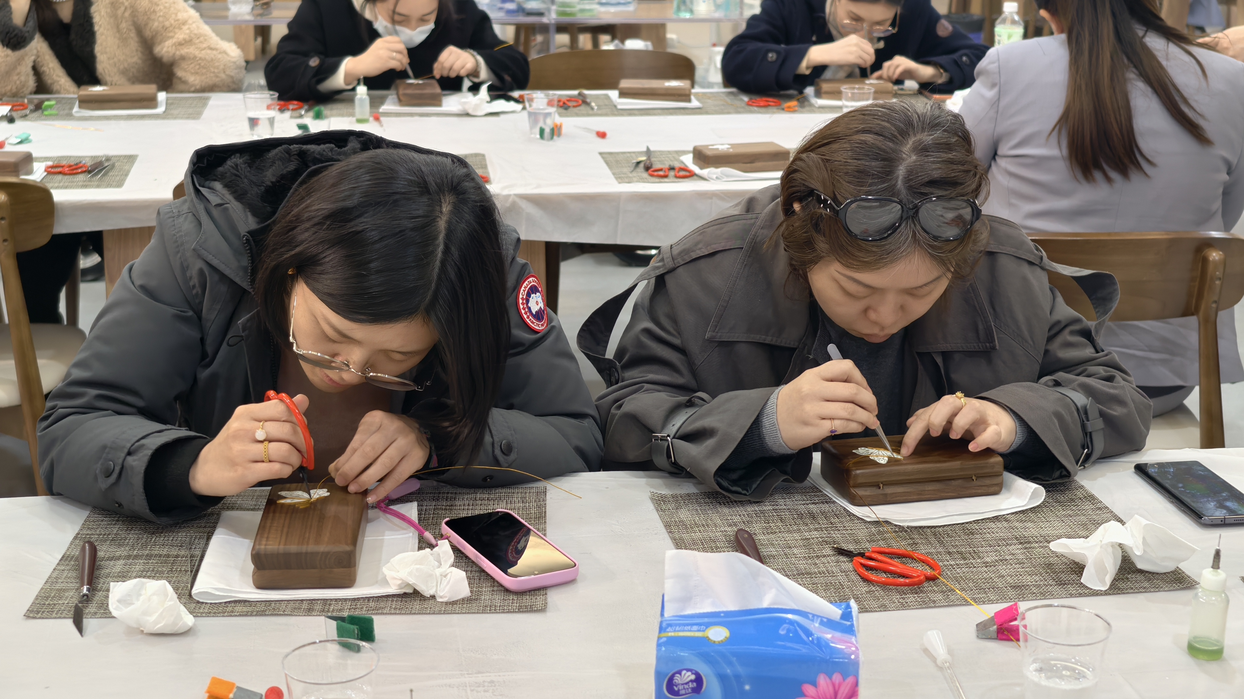 近日,渝中招商银行工会在我校非遗基地开展掐丝珐琅体验活动。员工们从蝴蝶、玉兰等图案中自主选题,专注完成掐丝、点蓝等环节,亲身感受非遗匠心。未来将深化“非遗+”模式,开展更多非遗体验项目。
